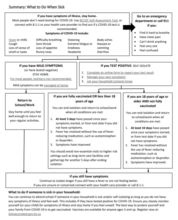 Staff, students, parents and caregivers are also encouraged to use the BCCDC online Self-Assessment Tool, or call 8-1-1 or their health care provider.
