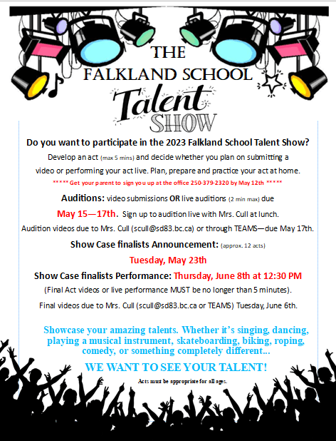 Show Case Finalist Performance – Thursday, June 8th 12:30 in the Falkland School Gymnasium (Final videos to Mrs. Cull June 6th)