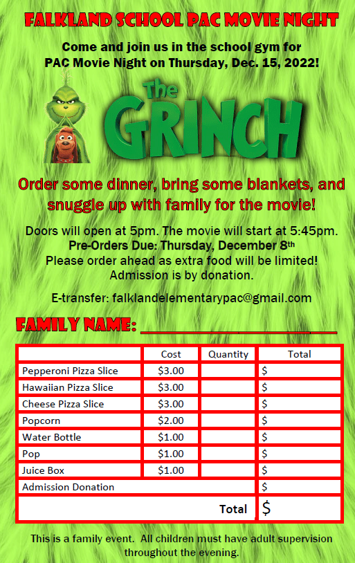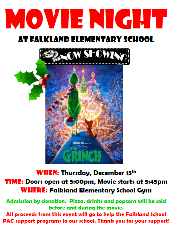 Please see the information below about our upoming Family Movie Night. Thanks to our Falkland School PAC.