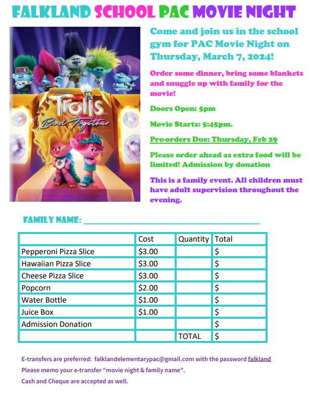 Mark your calendars for our Upcoming Family Movie Night (PAC) on Thursday, March 7th. Order forms will be coming home with students soon.
